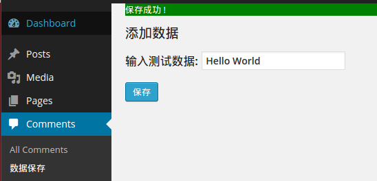 // 在WordPress后台评论处添加一个子菜单 add_action('admin_menu', 'comments_submenu'); function comments_submenu() { add_comments_page(__('数据保存'), __('数据保存'), 'read', 'my-unique-identifier-datasave', 'add_comments_submenu'); } // WordPress后台评论处菜单page function add_comments_submenu(){ if($_POST['test_hidden'] == 'y') { update_option('test_input_c',$_POST['test_insert_options']); //更新你添加的数据库 ?> <div id="message" style="background-color: green; color: #ffffff;">保存成功 !</div> <?php } ?> <div> <?php screen_icon(); //显示图标 ?> <h2>添加数据</h2> <form action="" method="post" id="my_plugin_test_form"> <h3> <label for="test_insert_options">输入测试数据:</label> <input type="text" id="test_insert_options" name="test_insert_options" value="<?php echo esc_attr(get_option('test_input_c')); ?>" /> </h3> <p> <input type="submit" name="submit" value="保存" class="button button-primary" /> <input type="hidden" name="test_hidden" value="y" /> </p> </form> </div> <?php } // 通过get_option()来显示存在数据库中的信息。 // 以上填写的信息都存在了数据库中的wp_options表里面。