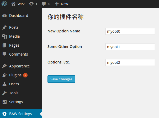 <?php // 创建自定义插件设置菜单 add_action('admin_menu', 'baw_create_menu'); function baw_create_menu() { // 创建新的顶级菜单 add_menu_page('BAW Plugin Settings', 'BAW Settings', 'administrator', __FILE__, 'baw_settings_page', ''); // 调用注册设置函数 add_action( 'admin_init', 'register_mysettings' ); } function register_mysettings() { // 注册我们的设置 register_setting( 'baw-settings-group', 'new_option_name' ); register_setting( 'baw-settings-group', 'some_other_option' ); register_setting( 'baw-settings-group', 'option_etc' ); } function baw_settings_page() { ?> <div class="wrap"> <h2>你的插件名称</h2> <form method="post" action="options.php"> <?php settings_fields( 'baw-settings-group' ); // 设置字段 这个函数取代了 nonce magic, action field, and page_options ?> <?php do_settings_sections( 'baw-settings-group' ); // 这个函数取代了表单字段标记形式本身 ?> <table class="form-table"> <tr valign="top"> <th scope="row">New Option Name</th> <td><input type="text" name="new_option_name" value="<?php echo esc_attr( get_option('new_option_name') ); ?>" /></td> </tr> <tr valign="top"> <th scope="row">Some Other Option</th> <td><input type="text" name="some_other_option" value="<?php echo esc_attr( get_option('some_other_option') ); ?>" /></td> </tr> <tr valign="top"> <th scope="row">Options, Etc.</th> <td><input type="text" name="option_etc" value="<?php echo esc_attr( get_option('option_etc') ); ?>" /></td> </tr> </table> <?php submit_button(); ?> </form> </div> <?php }?>