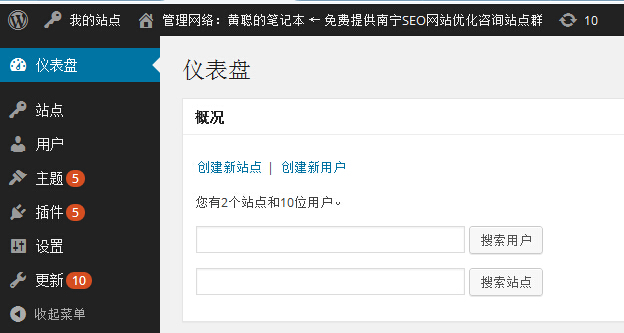 建立好了子站,我们需要有个地方配置所有子站的主题、插件等功能,我们可以在后台看到 我的站点--管理网络 如下图: