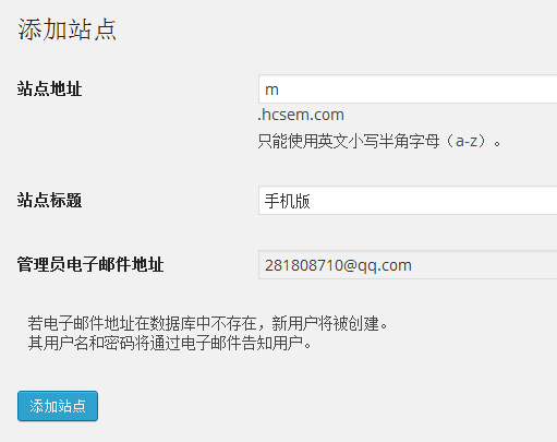 5、进入 我的站点 → 管理网络→站点 来创建一个站点,其中的的管理员电子邮箱要注意,如果填写的电子邮箱已经在数据库存在,也就是说已经存在这个用户,那么这个站点将会归这个用户所管;如果填写的电子邮箱数据库中不存在,则系统会自动创建这个用户,并把站点归这个用户所管。