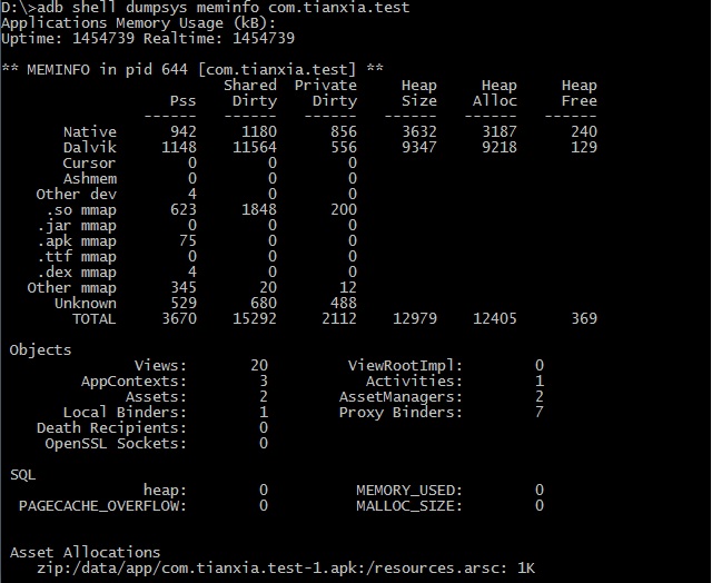 #查看应用com.tianxia.test的内存使用情况 adb shell dumpsys meminfo com.tianxia.test