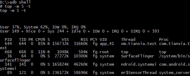其中-p参数输入的就是进程号,第一步中我们找到com.tianxia.test的进程ID是644,我们看看这个应用占用这么高的cpu在干嘛?