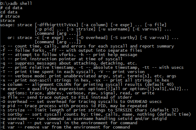 我们adb push strace /system/bin,在模拟器上是上传到/system/bin会报out of memory错误,我们也可以上传到/data目录下,如果没有执行权限,还需要chmod 777 strace.