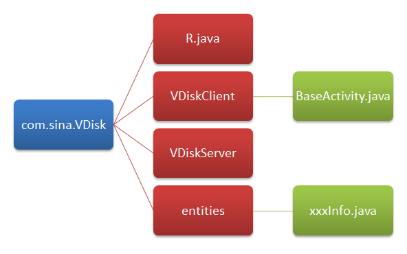 在主模块中定义基类,比如BaseActivity等,如果主模块下还有子模块,可以在主模块下建立子模块相应的包。说明一点,有的时候如果只有一个主模块,我们完全可以省略掉模块这一层,就是BaseActivity.java及其子模块直接提至第二层。