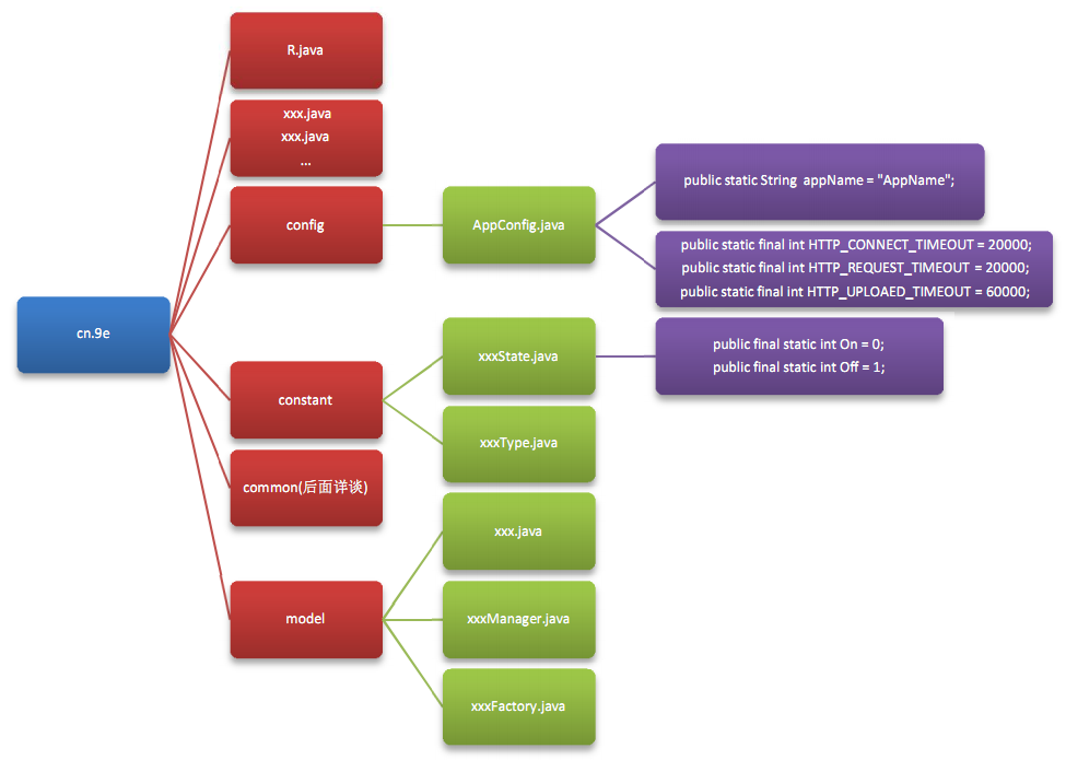 4).第二层中增加了前面微盘中没有涉及到的config,constant和common包。第一,其中config中存储一些系统配置,比如名称,应用参数等系统级的常量或者静态变量,当然,如果你有其他大模块的配置,比如如果拥有复杂的用户管理模块的话,完全可以增加一个UserConfig.java中存储用户的一些配置信息等等。第二,constant包,此包下存放的都是public static final常量,定义状态,类型等等。出于性能考虑,android开发中我不推荐使用枚举。common包中定义一个公用库,这里因为应用单一,无法很好的说明common包内容结构。
