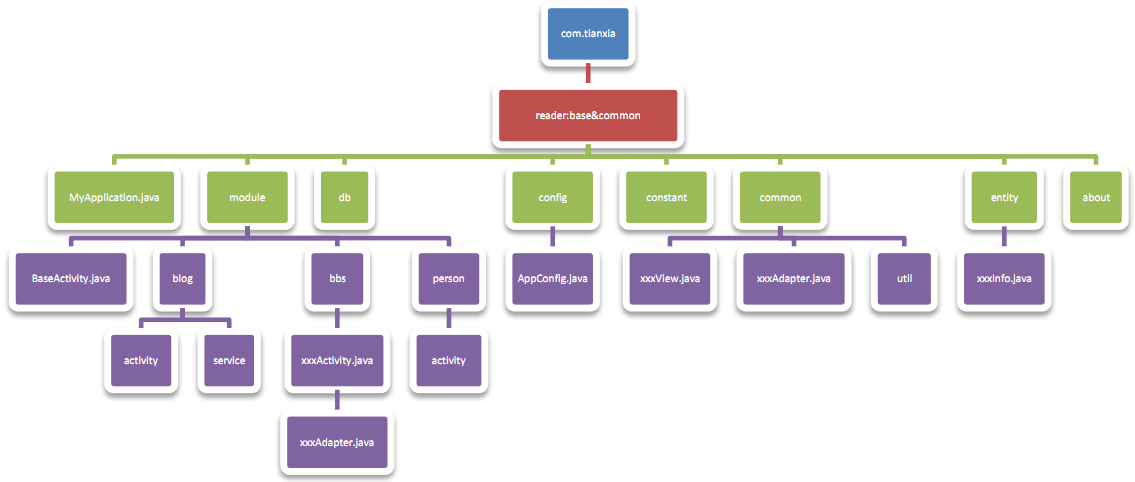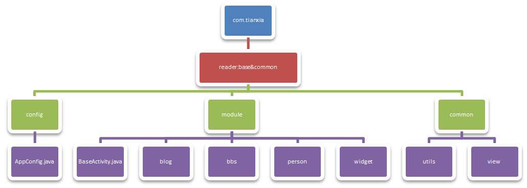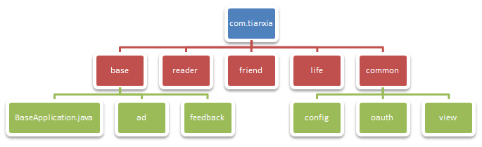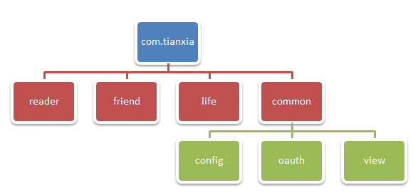 公司下开发3个应用reader,friend,life,其中common包为这三个应用共用,config,oauth为可选,view存放一些最通用的自定义view,比如对话框,定制的列表等,如果你觉得有些view可能不会通用,最好把它放在应用程序类的common包下。
