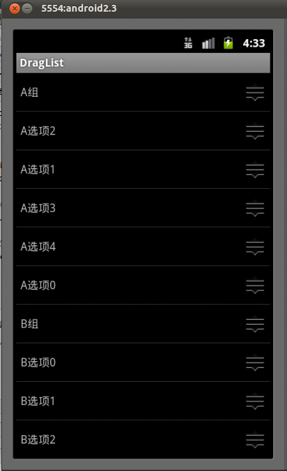 拓展:借鉴上一篇文章Android学习系列(9)--App列表之分组ListView,实现分组列表的拖拽效果。