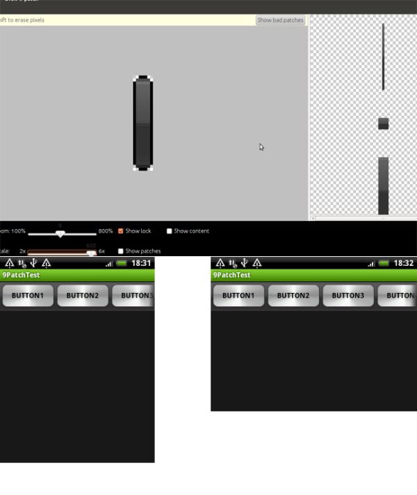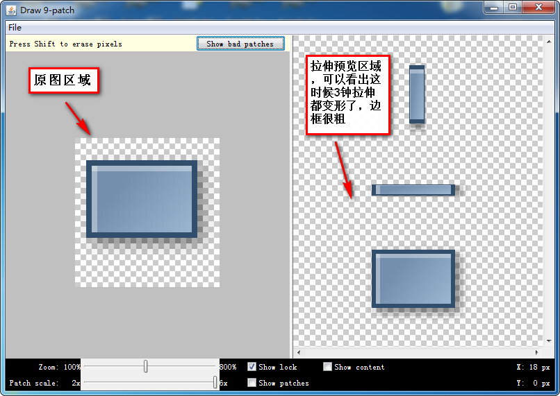 对于初学Draw9Patch的人来说,这可以算是高级技巧,那就是:拉伸区域,可以不是连续的,可以不止一块,而且是和自定义的边框线的长度成正比。