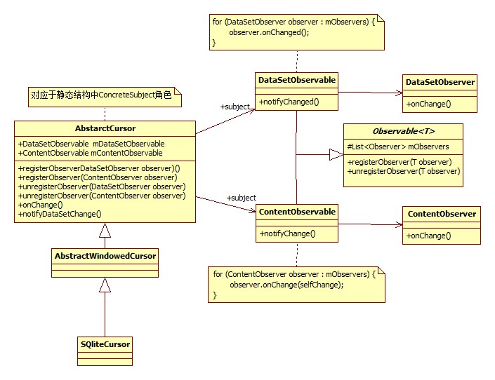 分析AbstractCursor的具体情况,我们发现实际工作有时需要对观察者进行统一管理,甚至观察者类型有很多种而又可以分成几个系列,这个时候是要复杂的多,通过合理的分层这个问题很好解决。下面根据具体情况,我们画出android中abstractCurosr中用到的观察者模式结构图: