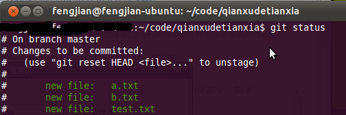 > cd qianxudetianxia/ > touch test.txt //创建test.txt文件 > git add test.txt //添加到本地版本库 > touch a.txt b.txt //创建多个文件 > git add . //提交当前文件夹的增加项到本地版本库