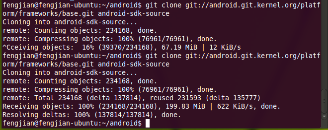 //进入之前建立的android目录 $cd android //克隆服务器端的base的版本库和代码到android-sdk-source目录下 $git clone git://android.git.kernel.org/platform/frameworks/base.git android-sdk-source
