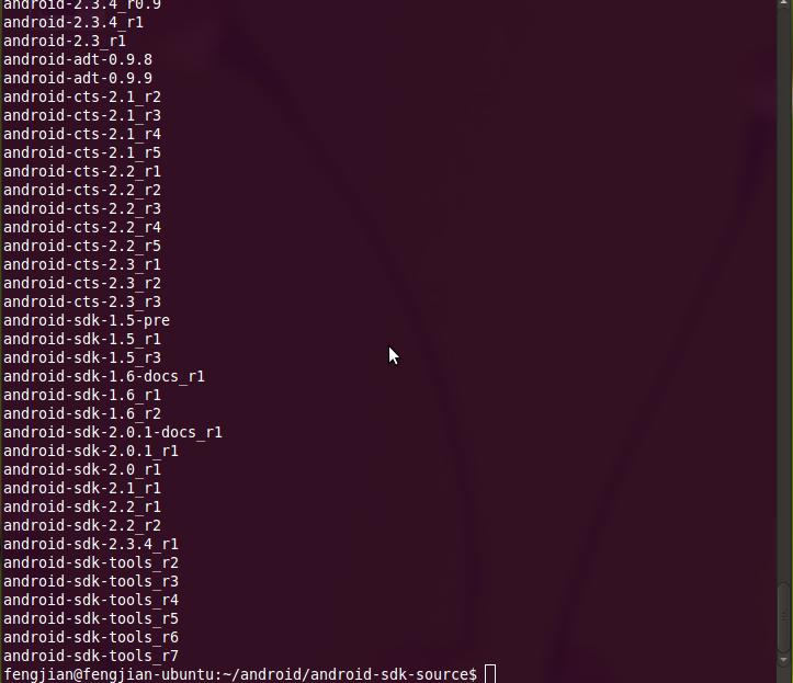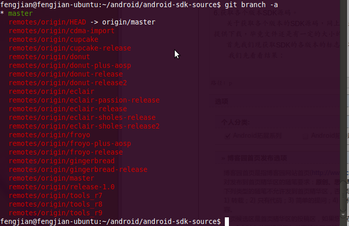 //进入base版本库目录 $cd android-sdk-source //显示所有的分支,包括远程和本地分支,我们没有建立分支,所有没有本地分支 $git branch -a //显示所有标签 $git tag