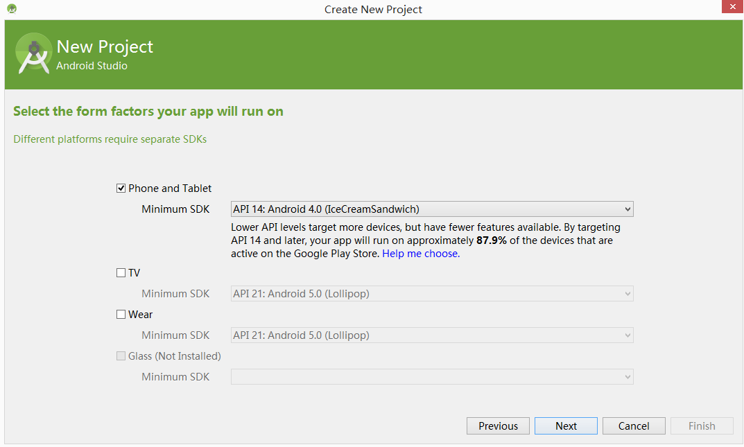 2.选择项目的类型,有四种分别是手机和平板应用,TV应用,可穿戴应用,Class应用,我们开发一般只涉及到了第一种