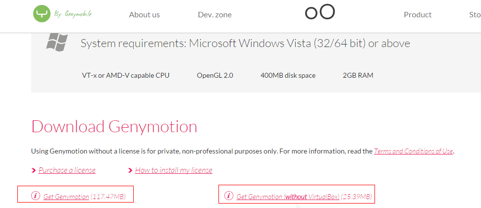 需要说明的一点就是Genymotion是依赖于VirtualBox的,就是你的电脑必须安装的有VirturalBox才可以运行的,如果你电脑没有直接下载第一个框框中的就行。默认的自带的VirtualBox是4.2.12,官网最新的是4.3.20,下载地址https://www.virtualbox.org/wiki/Downloads;简单的看下安装过程吧: