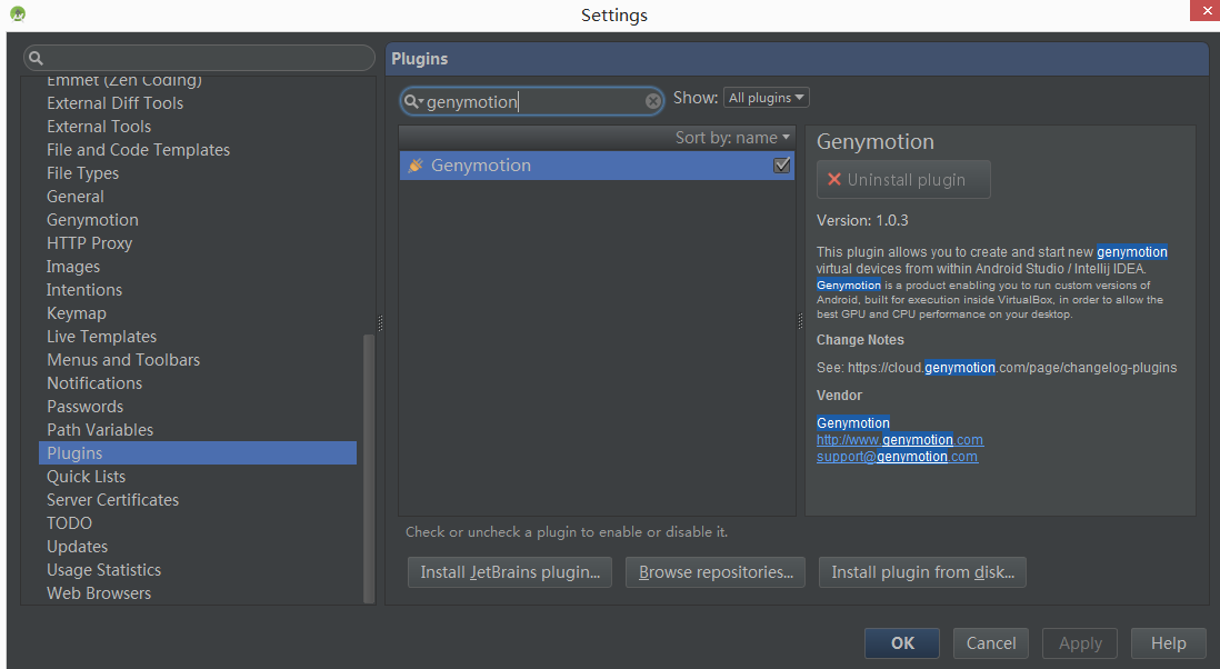 之后的操作就都很简单了,都是下一步的操作,之后的话在设置中插件中搜索genymotion(之前的都是白天的主题,这个换了一个夜间的,截图有的是昨天的,有点今天的)