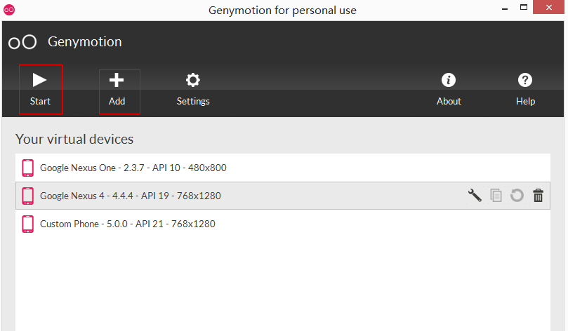 启动本地的Genymotion,按钮很简单就三个,启动,添加,设置: