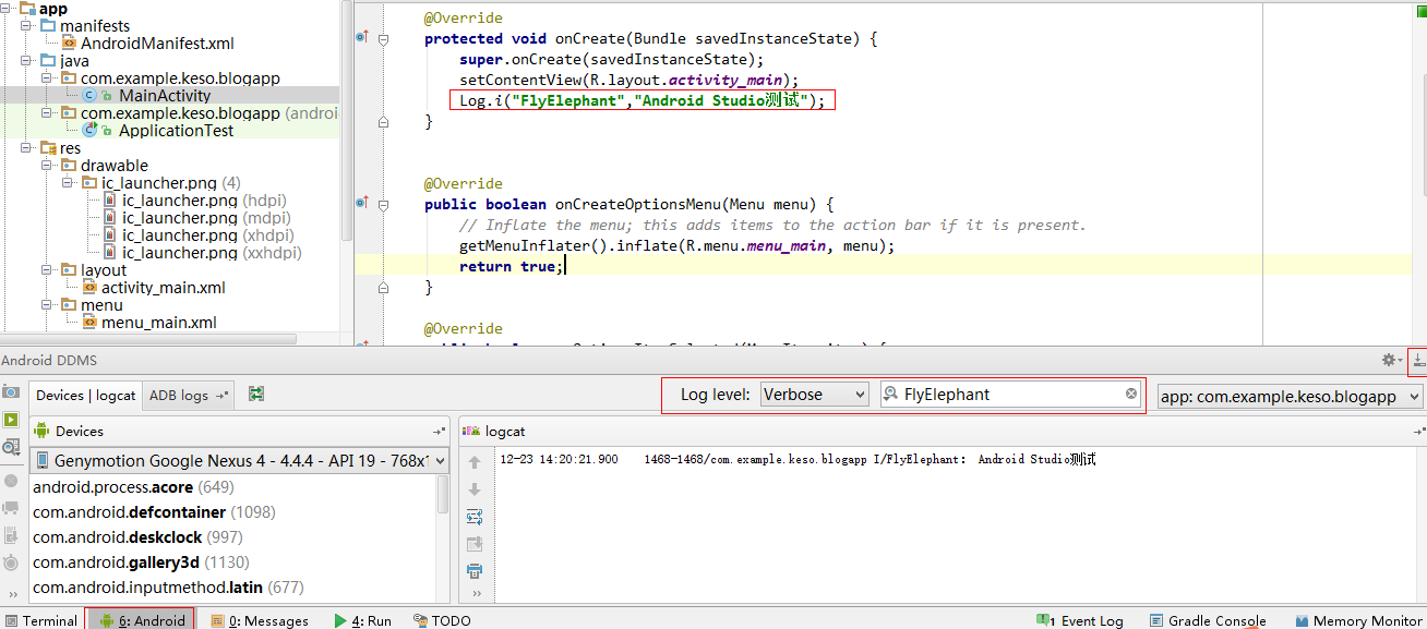Android Studio的Log和之前的Eclipse有点不一样,新增一个测试的Log,简单的对比下效果:
