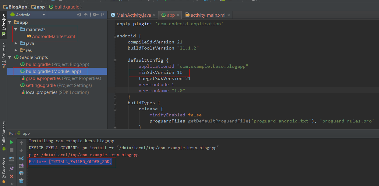 正常的项目到这里一般都会运行成功的,但是有可能会遇到一个错误就是Failure [INSTALL_FAILED_OLDER_SDK],这是因为项目最低支持的版本是14,而模拟器是10,高于模拟器的版本,重新修改一下即可: