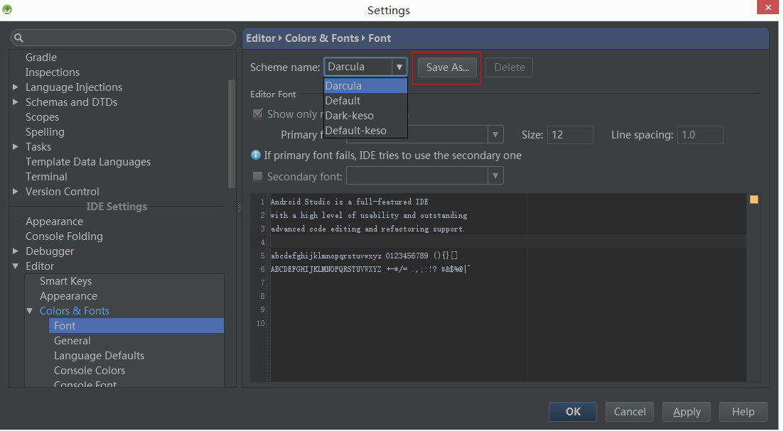 一般来说安装完Android默认的白色主题,而且字体比较小,看起来不是那么的绚丽,因此网上大家看的Android Studio截图都是,上面有个截图,通过那个齿轮小图标进入设置,默认有两种主题Default是白色背景,Darcula是黑色背景,根据个人需要Save As一下,之后的话还可以进行删除,我新增了两个,Dark-keso和Default-keso。