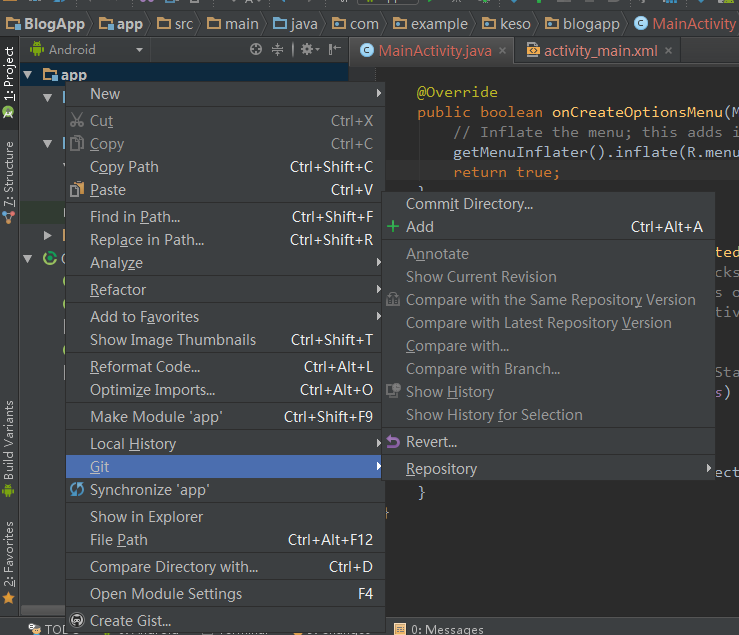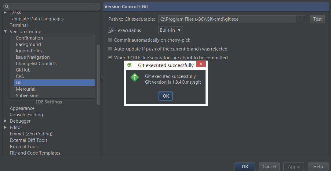 Android Studio对于版本控制做的比较好,同样的通过Setting进入,流行的是Git,先点Test测试一下,如果是成功的,可以进行接下来的操作: