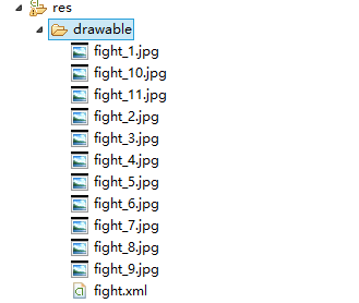 首先在res中新建一个drawable文件夹,将需要展示的图片放在里面,同样的还有展示图片的fight.xml文件,代码如下: