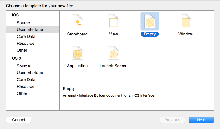 1.首先新建一个CustomCell.xib文件,方式如下: