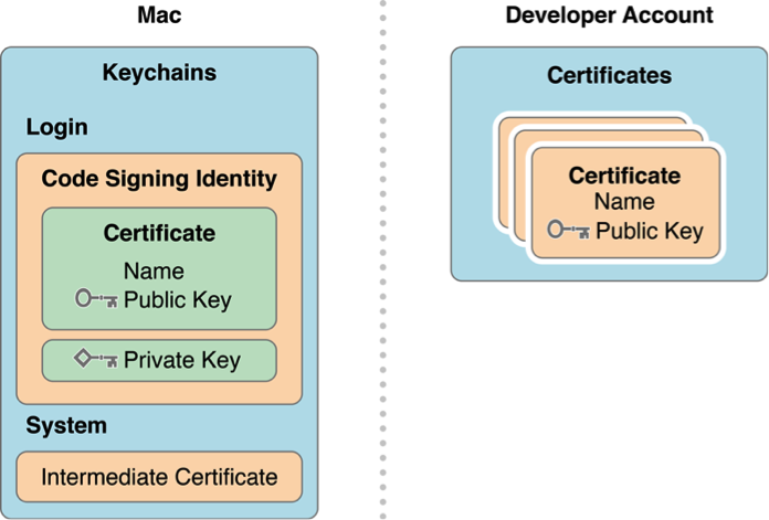 申请一个Certificate之前,需要先申请一个Certificate Signing Request (CSR) 文件,而这个过程中实际上是生成了一对公钥和私钥,保存在你Mac的Keychain中。代码签名正是使用这种基于非对称秘钥的加密方式,用私钥进行签名,用公钥进行验证。如下图所示,在你Mac的keychain的login中存储着相关的公钥和私钥,而证书中包含了公钥。你只能用私钥来进行签名,所以如果没有了私钥,就意味着你不能进行签名了,所以就无法使用这个证书了,此时你只能revoke之前的证书再申请一个。因此在申请完证书时,最好导出并保存好你的私钥。当你想与其他人或其他设备共享证书时,把私钥传给它就可以了。私钥保存在你的Mac中,而苹果生成的Certificate中包含了公钥。当你用自己的私钥对代码签名后,苹果就可以用证书中的公钥来进行验证,确保是你对代码进行了签名,而不是别人冒充你,同时也确保代码的完整性等。