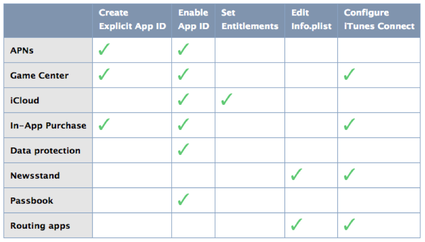 每创建一个App ID,我们都可以设置该App ID所使用的APP Services,也就是其所使用的额外服务。每种额外服务都有着不同的要求,例如,如果要使用Apple Push Notification Services,则必须是一个explicit App ID,以便能唯一标识一个应用程序。下面是目前所有可选的服务和相应的配置要求。