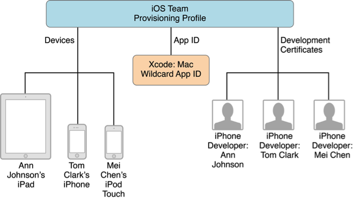 iOS Team Provisioning Profile是第一次使用Xcode添加设备时,Xcode自动生成的,它包含了Xcode生成的一个Wildcard App ID(*,匹配所有应用程序),账户里面所有的Devices和所有Development Certificates,如下图所示。因此,team中的所有成员都可以使用这个iOS Team Provisioning Profile在team中的所有设备上调试所有的应用程序。并且当有新设备添加进来时,Xcode会更新这个文件。