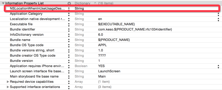 3.如果不能弹出以上信息,你需要在Info.plist文件中设置一下,加入一个NSLocationWhenInUseUsageDescription(前台获取GPS定位),NSLocationAlwaysUsageDescription(前后台获取GPS定位),Value可以为空;