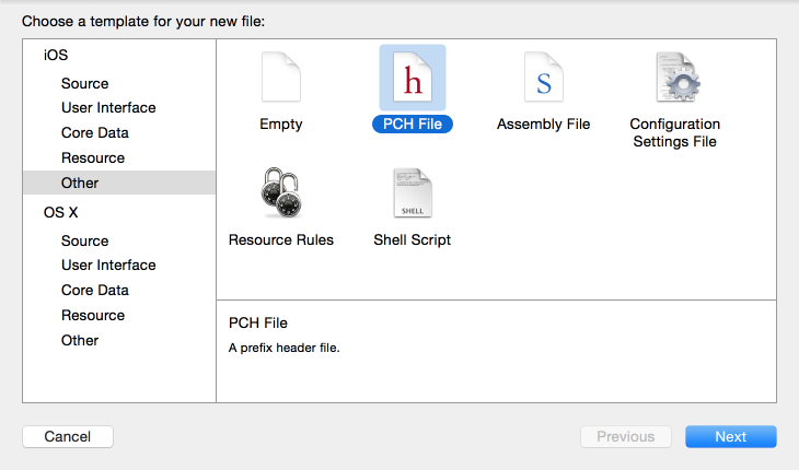 在之前的xCode中是默认的有pch文件的,xCode6.1中没有,需要新建一个pch文件: