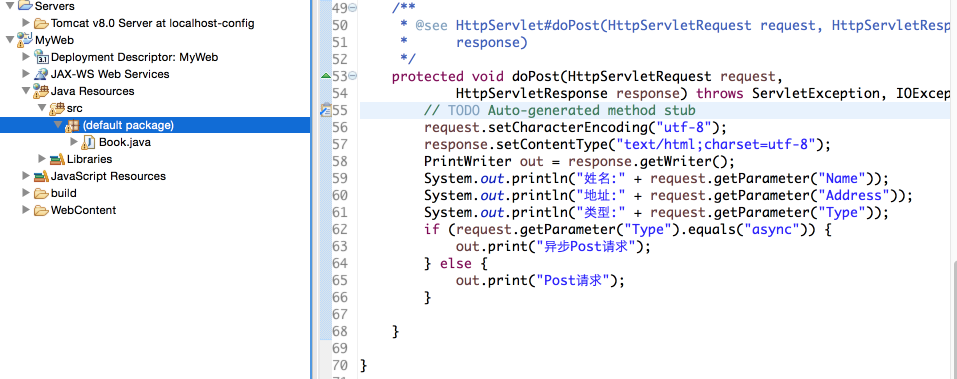 异步的请求比较简单,需要的方法都已经被封装好了,需要注意数据是动态拼接的,请求的代码都是在Java Servlet中实现的,Java项目中的目录如下: