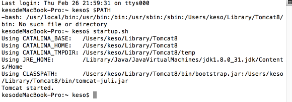 ③输入export PATH=$PATH:/Users/keso/Library/Tomcat8/bin
