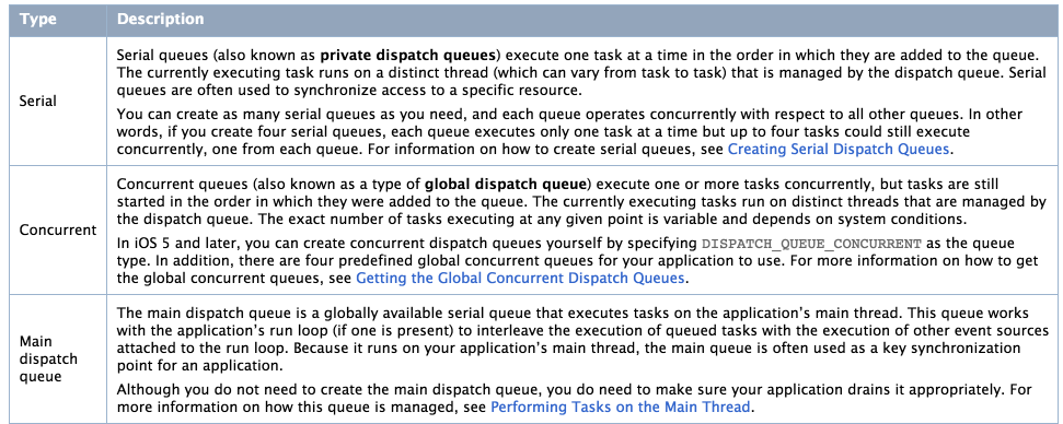 Grand Central Dispatch(GCD)是一个强有力的方式取执行多线程任务,不管你在回调的时候是异步或者同步的,可以优化应用程序支持多核心处理器和其他的对称多处理系统的系统。开发使用的过程中只需要将执行的任务并添加到到适当的Dispatch Queue中,GCD就能生成必要的线程并计划执行任务。Dispatch Queue更简单而且在实现符合需求的多线程任务时更有效率。Dispatch Queue一般来说有三种方式,如下图: