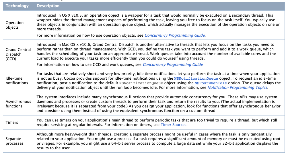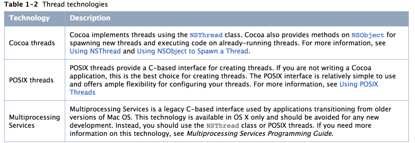 iOS和OS X线程的底层实现机制是Mach线程,我们基本不会处理线程到这个级别,一般应用中可以使用的线程管理技术有Cocoa threads,POSIX threads,Mulitprocessing Services,通过我们选择实战的方式就是Cocoa threads。