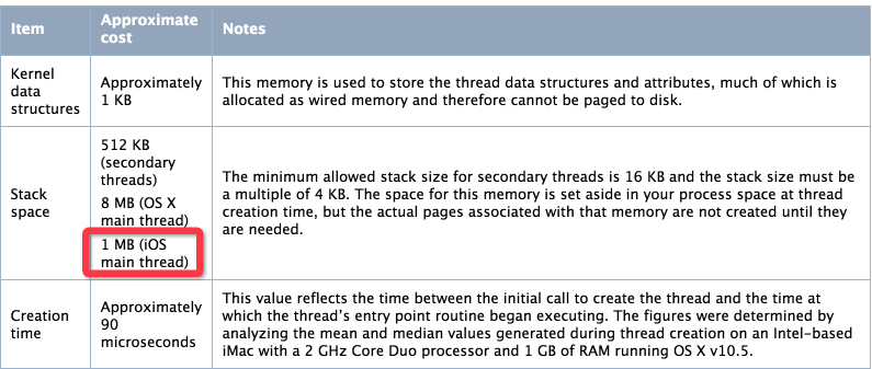 iOS和OS X中的应用可以是单线程也可以是多线程的,iOS的应用相当于一个PC上常说的进程,可以扩展子线程,扩展出来的子线程拥有可执行的栈和运行时调度在内存中。线程可以与其他线程或者进程之间通信,一般都是通过I/O读写操作或者其他你需要的方式。同一个应用中的线程拥有同样的虚拟内存空间和访问应用程序进程的权利,简单理解可以理解为在方法中可以访问全局变量。网上很多文章都讨论多线程,不过很少说一些具体线程的分配的空间,一下也是本人从苹果官网找的一张关于线程空间分配的图片: