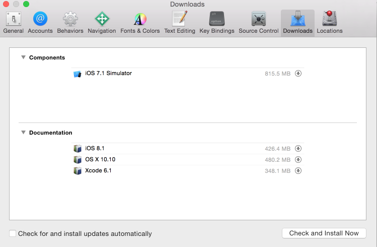 首先看一下正常下载的方法,这种方式很慢,打开xCode,在xCode->Preferences中可以看到以下效果: