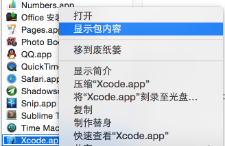 我们需要研究以下这三个下载之后的文件的位置,在应用程序中找到xCode.app,右击选择显示包内容: