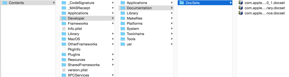 iOS开发肯定离不开开发文档,苹果有在线帮助文档,xCode其实可以下载模拟器文档和iOS8.1文档的,不过下载的速度实在不敢恭维,而且比较头疼的是不显示下载进度条的,苹果的开发文档都是放在)/应用程序/Xcode.app/Contents/Developer/Documentation/DocSets路径下,该路径下可以看到三个文件,xCode 6.1文档(com.apple.ADC_Reference_Library.DeveloperTools.6_0_1.docset),iOS8.1文档(com.apple.adc.documentation.AppleiOS8.1.iOSLibrary.docset),OS X文档(com.apple.adc.documentation.AppleOSX10.10.CoreReference.docset).