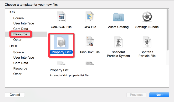 简单创建文件就是说可以直接从xCode创建,右击项目new File,可以添加一个plist文件: