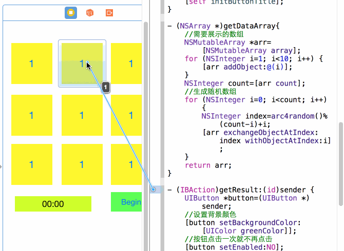 功能基本上就是设置按钮的背景颜色,是否可以点击,计时,清零,弹框,显示之前点击的结果,一步一步的分析: