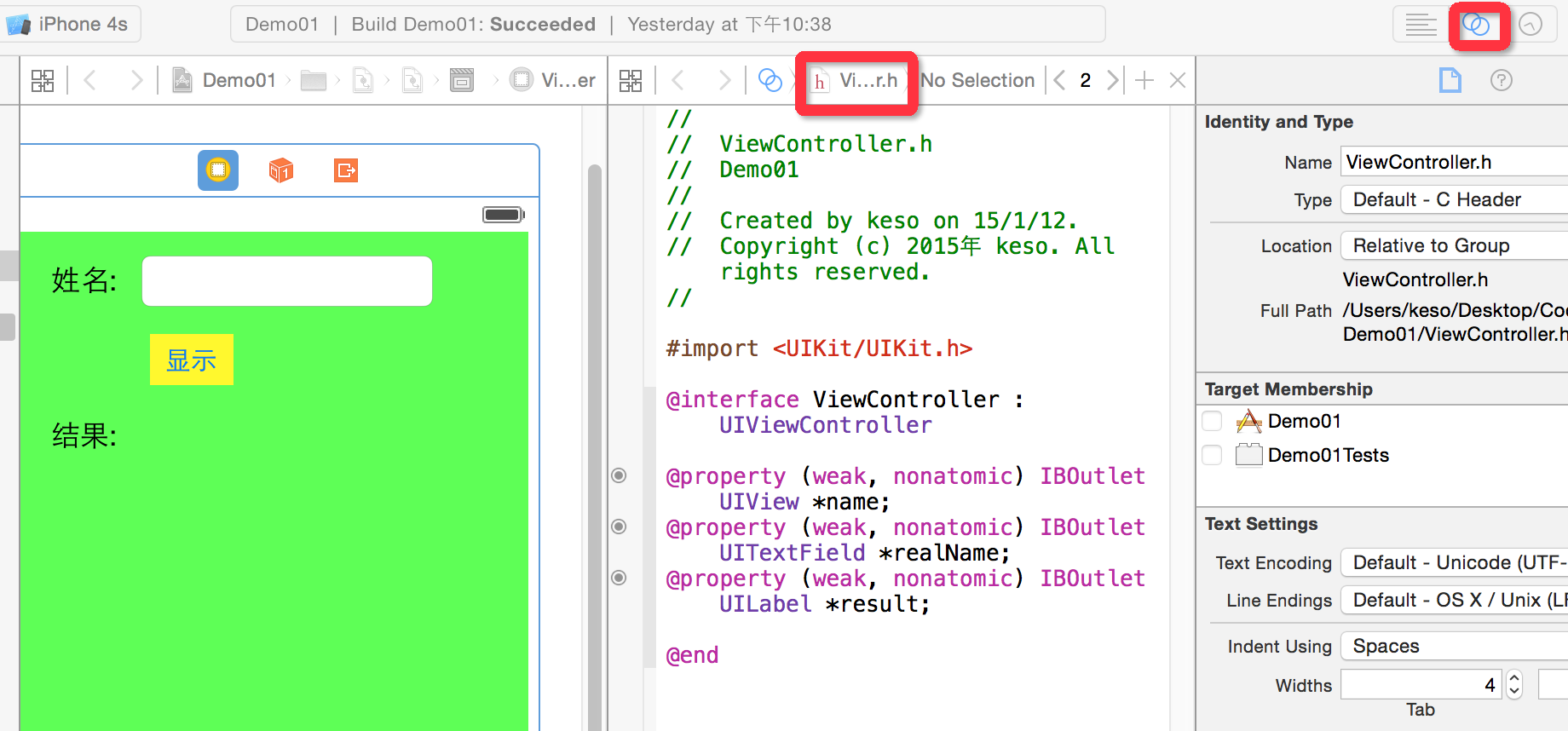 // // ViewController.h // Demo01 // // Created by keso on 15/1/12. // Copyright (c) 2015年 keso. All rights reserved. // #import <UIKit/UIKit.h> @interface ViewController : UIViewController @property (weak, nonatomic) IBOutlet UIView *name; @property (weak, nonatomic) IBOutlet UITextField *realName; @property (weak, nonatomic) IBOutlet UILabel *result; @end