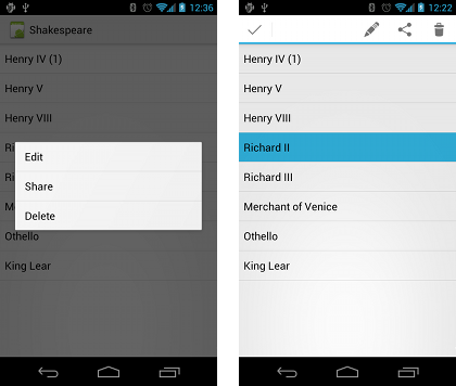Android 3.0以前,我们处理列表的长按事件经常使用Context Menu,Android3.0以后,我们有了新的选择:ActionMode。下图左边效果为Context Menu右边效果为ActionMode。