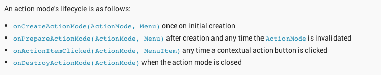 1、实现ActionMode.Callback接口,并处理ActionMode的生命周期,ActionMode的生命周期如下图:
