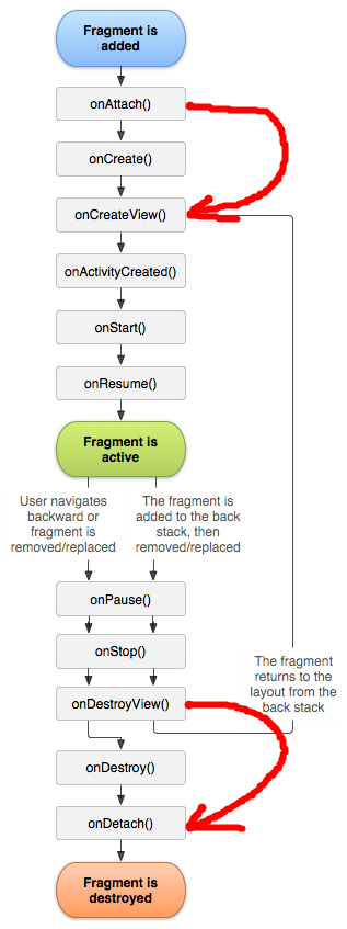 View onCreateView (LayoutInflater inflater, ViewGroup container, Bundle savedInstanceState)--Called to have the fragment instantiate its user interface view. This is optional, and non-graphical fragments can return null (which is the default implementation). This will be called betweenonCreate(Bundle)andonActivityCreated(Bundle).