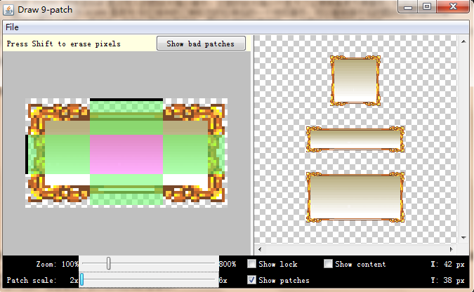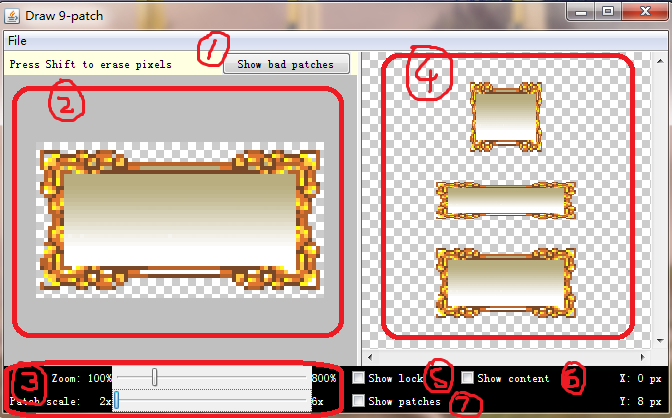 序列 ① :在拉伸区域周围用红色边框显示可能会对拉伸后的图片产生变形的区域,如果完全消除该内容则图片拉伸后是没有变形的,也就是说,不管如何缩放图片显示都是良 好的。 (实际试 发现NinePatch编辑器是根据图片的颜色值来区分是否为bad patch的,一边来说只要色差不是太大不用考虑这个设置。)