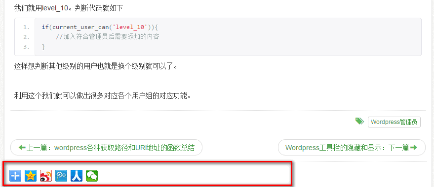 <script>window._bd_share_config={"common":{"bdSnsKey":{},"bdText":"","bdMini":"2","bdMiniList":false,"bdPic":"","bdStyle":"0","bdSize":"16"},"share":{}};with(document)0[(getElementsByTagName('head')[0]||body).appendChild(createElement('script')).src='http://bdimg.share.baidu.com/static/api/js/share.js?v=89860593.js?cdnversion='+~(-new Date()/36e5)];</script>在你页面中需要显示百度分享的地方加入此代码,一般在文章的底部。下面红色框内是我网站的代码放置位置