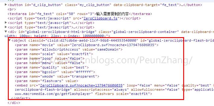 首先看下图是为使用Zero Clipboard后生成的flash对象,它能兼容的flash10及以下版本,兼容所有的浏览器: