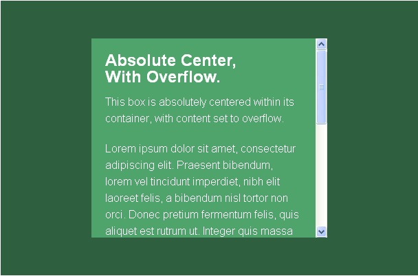 height: auto;“完全居中”法的确需要声明容器高度,但是高度受max-height样式的影响,也可以是百分比。这非常适合响应式的方案,只需要设置好带溢出内容就行。