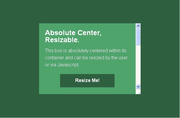 }使用其他样式,或者使用JavaScript调整内容区的大小,也是不用手动重新计算的!如果设置了resize的样式,甚至可以让用户自行调节内容区域的大小。 “完全居中”法,无论内容区怎么改变大小,都会保持居中。